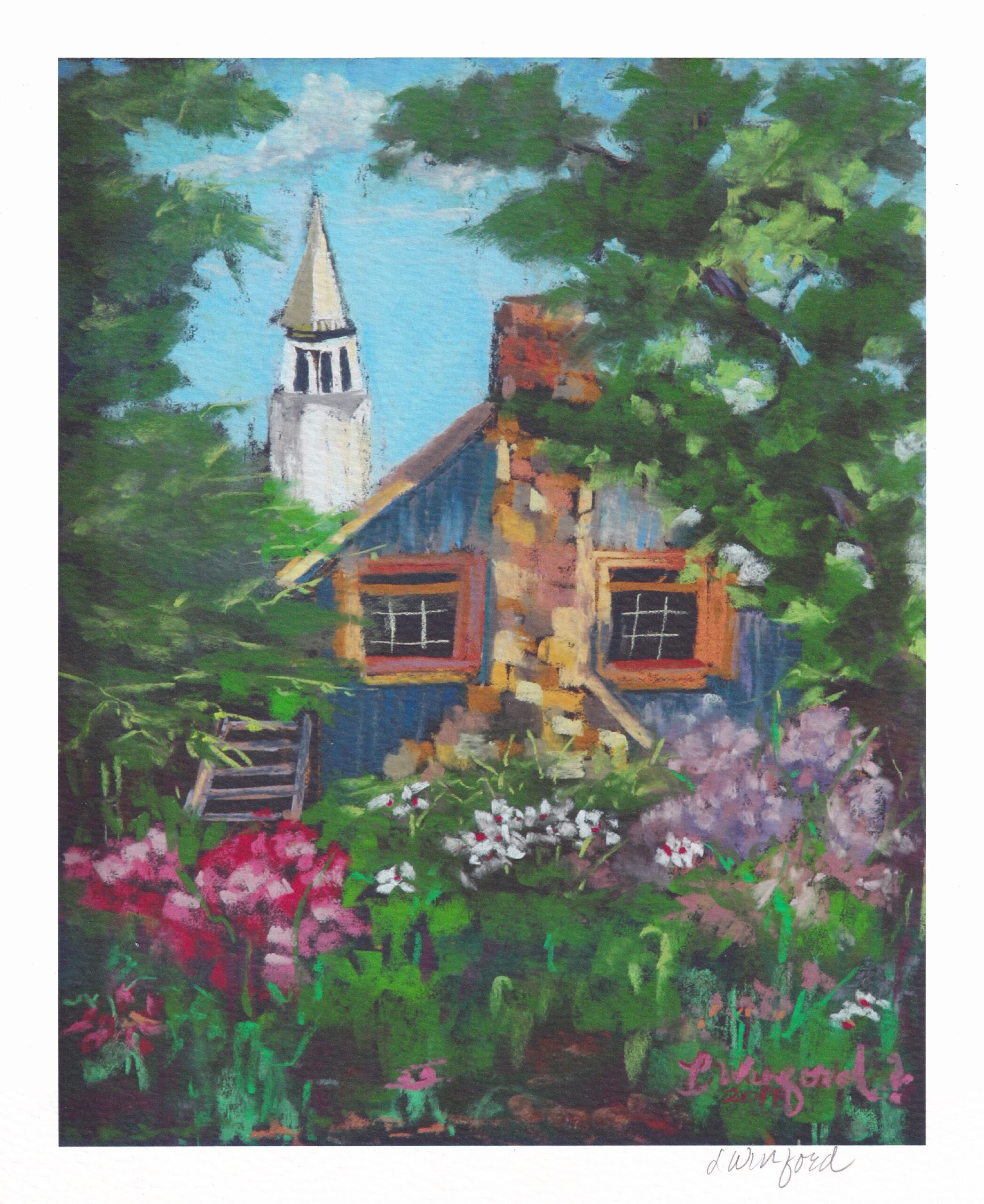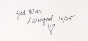 Jodi and I spent a week in Nashville, Indiana and I always keep my eyes and ears open to what is happening around me. We walked into a gallery I like going into when we are there and I looked around. This week we spent there was to be a chance to get away from being a pastor and I truly believe that God knew I needed to have someone other than Jodi or an awesome SPRC person like Mary Perren look after me. And God used that gallery to speak to me. Have you ever looked at something and later dreamed about it with the feeling you needed to go back and act on it? I did. Now as a pastor, my funds are limited but I did have enough to purchase a print from an artist there in Nashville. And when I went back to get it, I found out that she not only lived right around the corner from the gallery, but that she was the person tending the gallery (it is run by multiple artists in Nashville) the day I first looked at the print. So I went to her home as soon as I left the store. I had a conversation with this woman that went straight to my soul and I found myself asking if I could share her picture in this article. I also asked her if she would be so kind as to sign the print and she did with a lovely pencil signature on the front. But it was the message on the back that completed my walk with God this last week.
